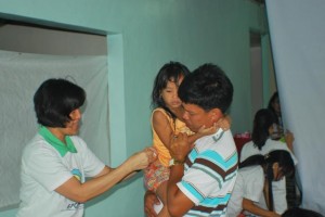 According to Dr. Demerre, the medical mission would veer away from the usual free clinic set-up to one geared towards education, to promote health awareness and prevent disease. Dr. Ang gave a brief discussion on the merits of preventive care in children and mothers and the benefits of proper breastfeeding and timely immunization. The pediatric patients queued up for routine check up and immunizations for measles, mumps and rubella (MMR) by Dr. Vicky Ang, assisted by volunteer nurse from the community, Ms. Renilyn Gay Aquino.